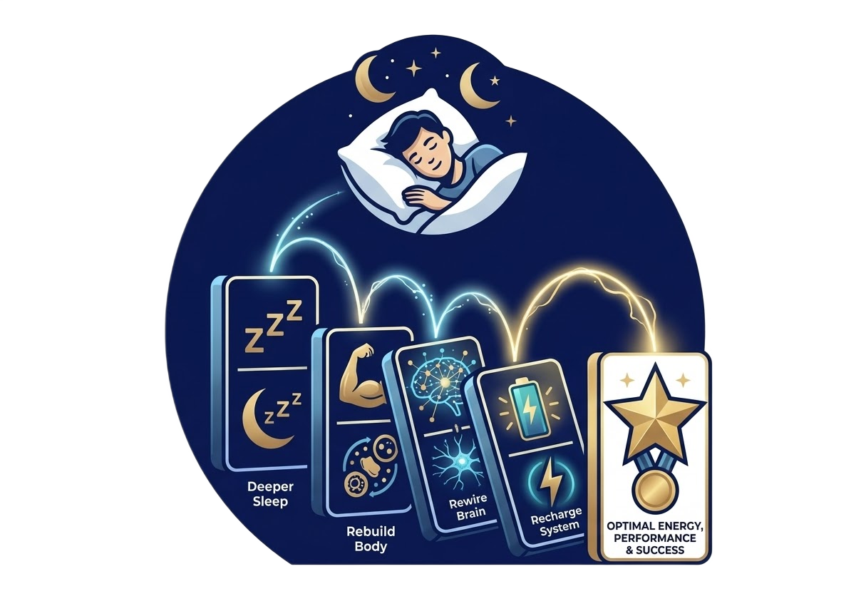When your sleep is 100% dialed in, you’ll unlock a version of yourself that automatically manifests more money, better relationships, a rejuvenated sense of happiness, and more freedom into your life.