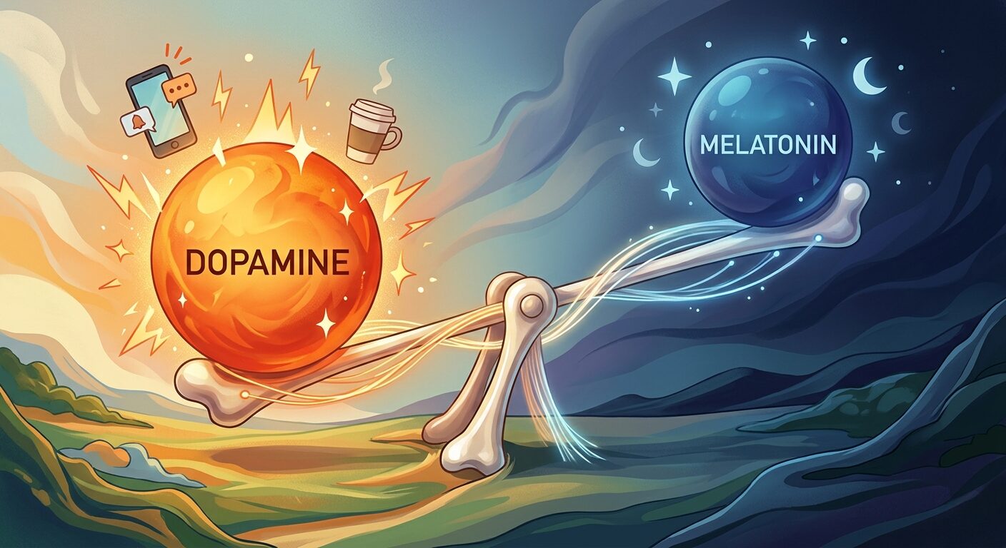 Dopamine and melatonin have an inverse relationship governed by the circadian clock. As dopamine falls in the evening, melatonin rises. When dopamine stays elevated — from screen stimulation, stress, or circadian disruption — melatonin release is actively suppressed. This is why late-night screen use is so damaging to sleep: it’s not just the blue light. It’s the dopamine hit from novel, stimulating content that directly suppresses the melatonin signal your brain needs to initiate sleep.