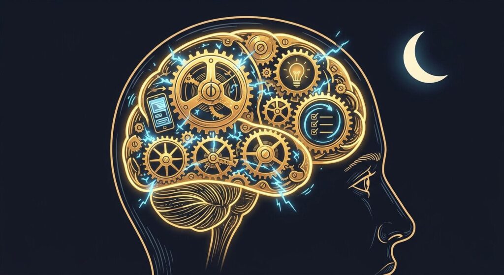 Excess dopamine activity at bedtime keeps the brain in seeking mode. You can’t stop thinking, planning, or mentally engaging with ideas. This isn’t anxiety in the traditional sense — it doesn’t carry the dread or worry of anxious rumination. It’s arousal. The brain is activated and oriented toward novelty and reward, which is precisely the opposite of the state needed for sleep.