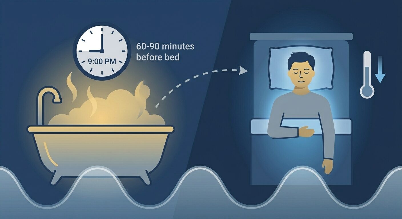 A warm bath or shower 60–90 minutes before bed is one of the most powerful and simplest deep sleep interventions available. It works by dilating peripheral blood vessels, which releases heat from the body’s core. The resulting drop in core temperature mimics — and amplifies — the natural circadian temperature decline that triggers N3 onset. A meta-analysis in Sleep Medicine Reviews found this approach increases slow-wave sleep duration by 15–36 percent. The timing matters: too close to bedtime and you’re still warm when you lie down; 60–90 minutes gives the body time to cool.