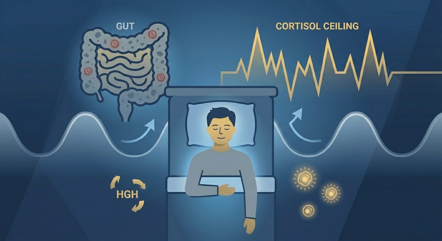 Deep sleep requires a cortisol trough. When the HPA axis is chronically activated — from stress, gut infections, or mold exposure — cortisol doesn’t reach the low point that N3 depends on. The body tries to enter deep sleep but gets pulled back to lighter stages by the cortisol ceiling. This is one reason stressed sleepers feel unrested regardless of sleep duration.