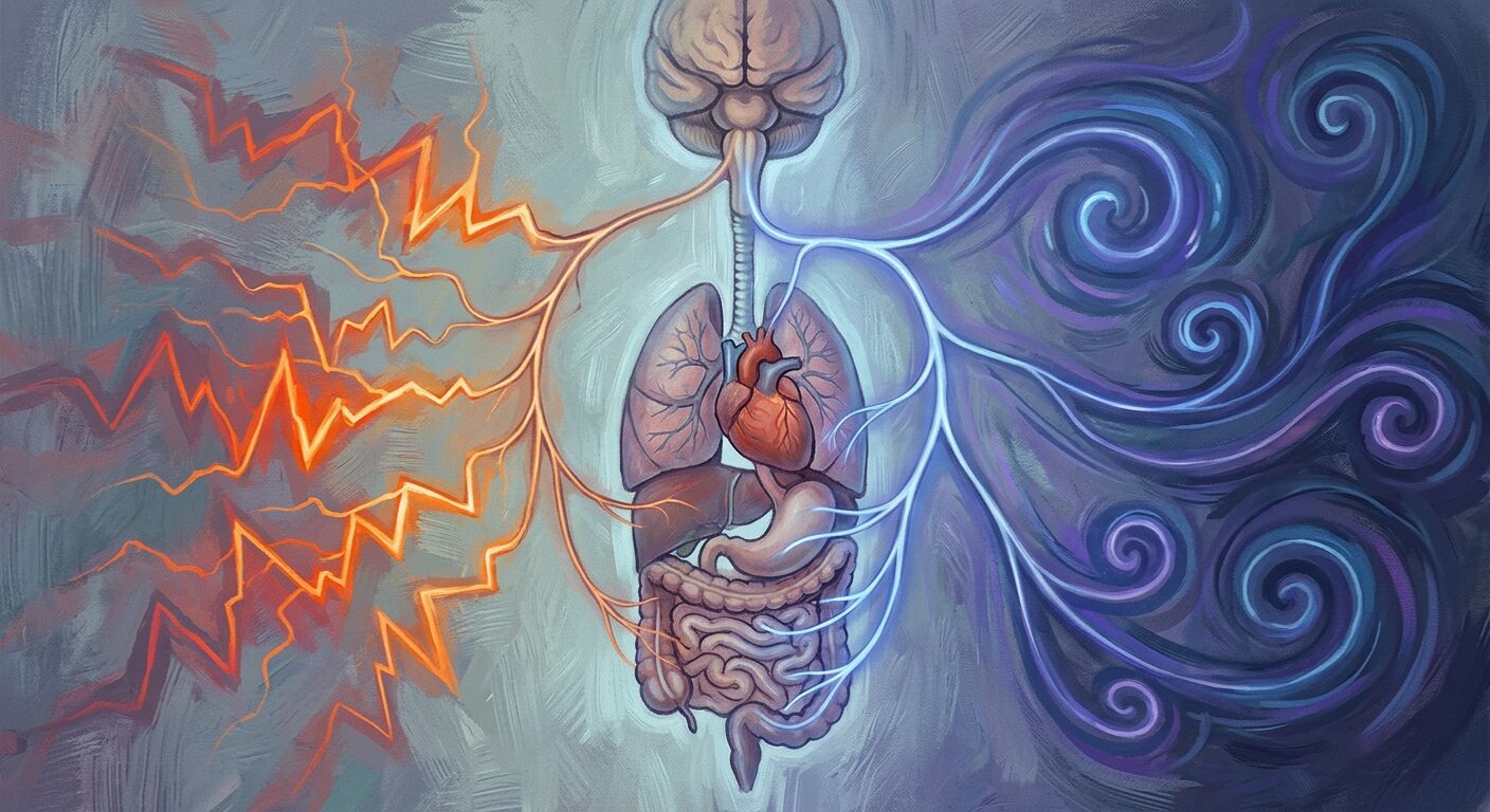 The right tool is your vagus nerve — the longest cranial nerve in the body and the master switch for the parasympathetic “rest and repair” system. When you activate it deliberately, the effect isn’t vague or gradual. Heart rate drops. Breathing deepens. Muscle tension releases. Blood pressure falls. The body shifts toward a measurable physiological state that allows sleep to happen.