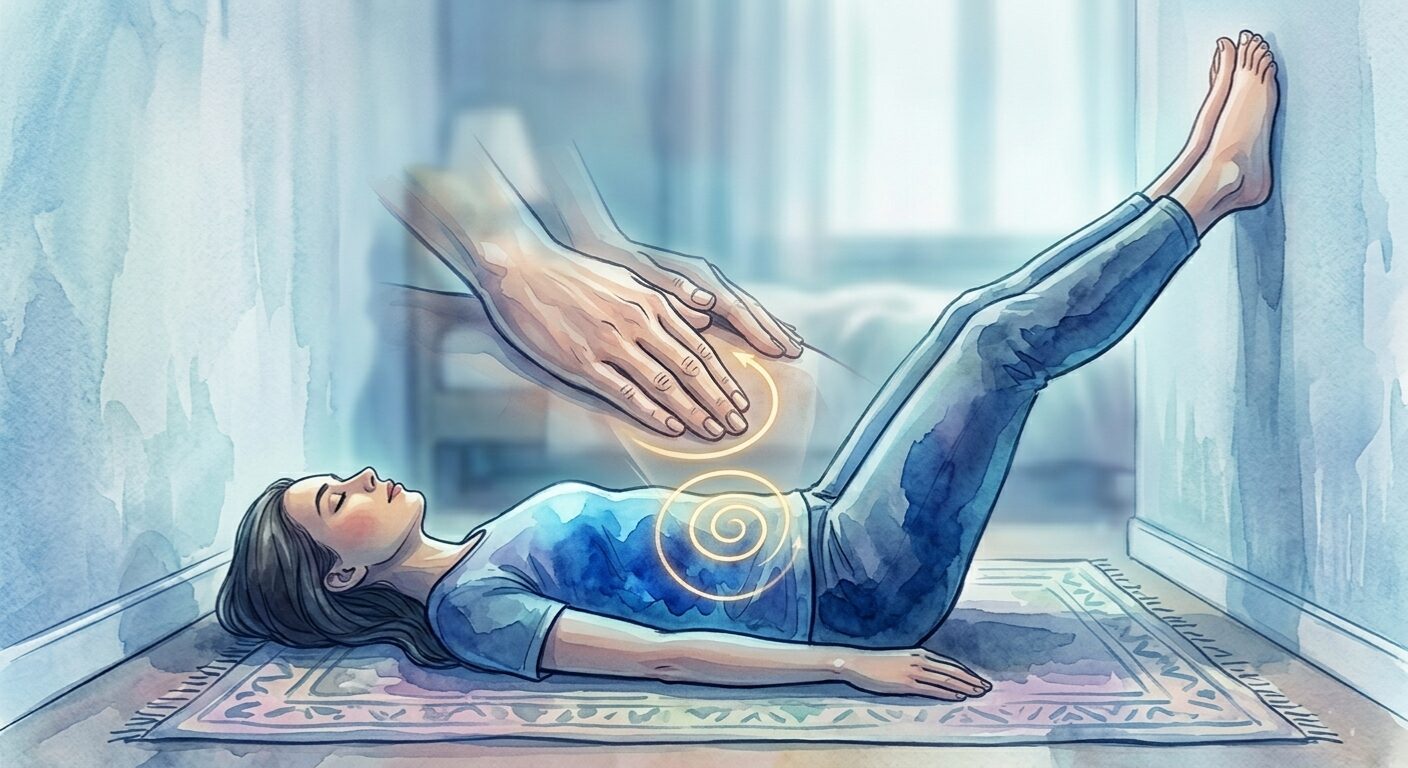 Use gentle pressure with the fingertips, moving clockwise around the navel for 3–5 minutes. The clockwise direction follows the natural path of the colon. This supports both vagal tone and digestive motility overnight.